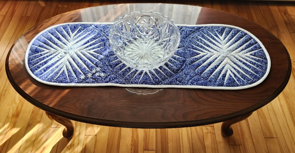 Runner: 12-1/2" x 33-1/4"; Placemat - 12-1/2" x 17-1/4" $14.95 This table runner and matching placemat are easily made with two simple blocks. The unusual outer shape adds flair to this appealing set.